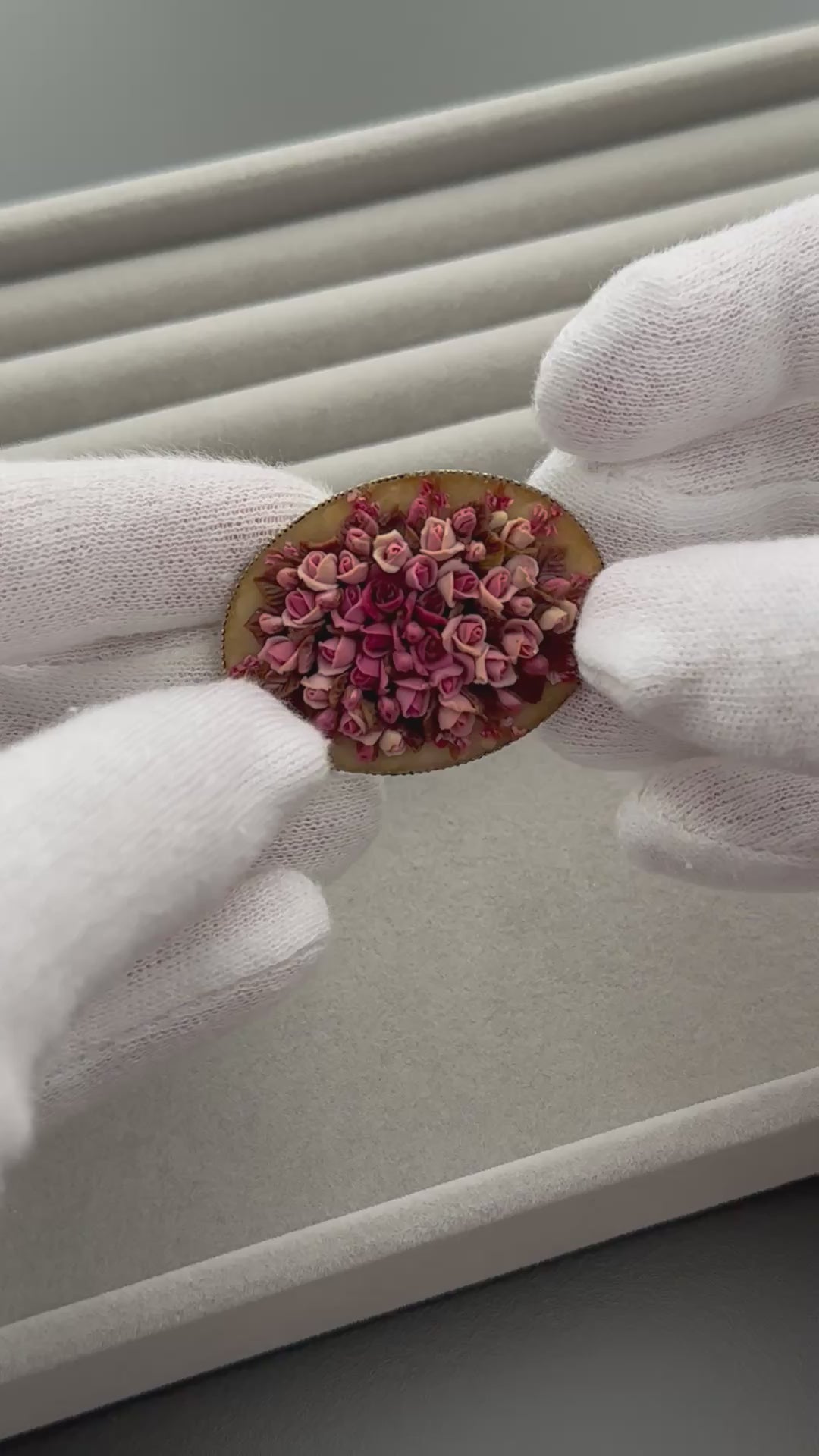 A delicate and truly one-of-a-kind handmade vintage brooch featuring a charming 3D bouquet of tiny pink and blush roses. The floral elements are sculpted from a lightweight resin / composition material, giving the piece a soft, romantic appearance without the weight of porcelain.
